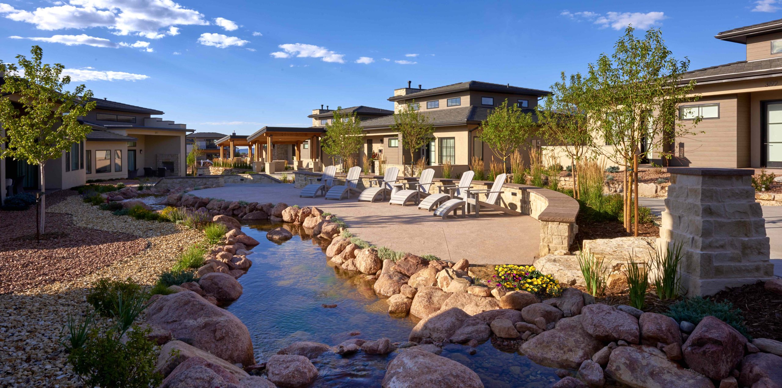 The furnishings are stunning and include a full kitchen, dining room, spacious living area with fireplace, and 5-piece ensuite bath with soaking tub in each bedroom. With water features and a calming stream winding through the residences, each luxury Casita in Colorado Springs has a private patio and inviting outdoor fireplace. Our Casitas are located within steps of Strata Spa and Salon and other resort amenities. However, none of our Cottages and Casitas have mountain views.