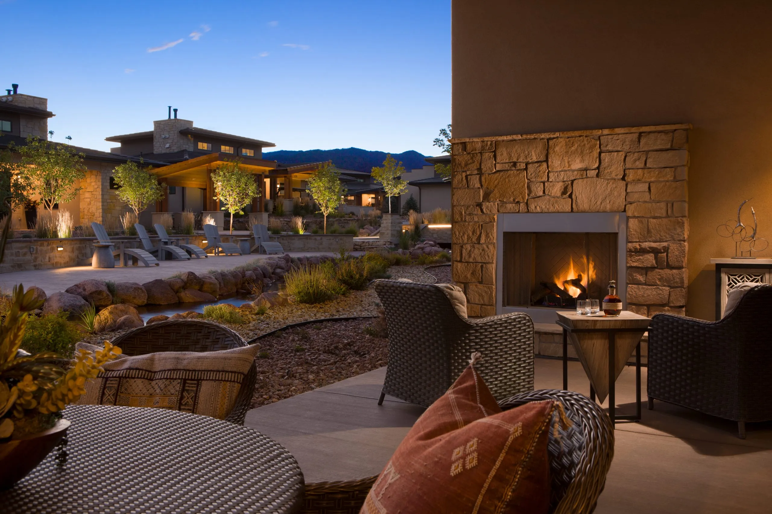 The furnishings are stunning and include a full kitchen, dining room, spacious living area with fireplace, and 5-piece ensuite bath with soaking tub in each bedroom. With water features and a calming stream winding through the residences, each luxury Casita in Colorado Springs has a private patio and inviting outdoor fireplace. Our Casitas are located within steps of Strata Spa and Salon and other resort amenities. However, none of our Cottages and Casitas have mountain views.